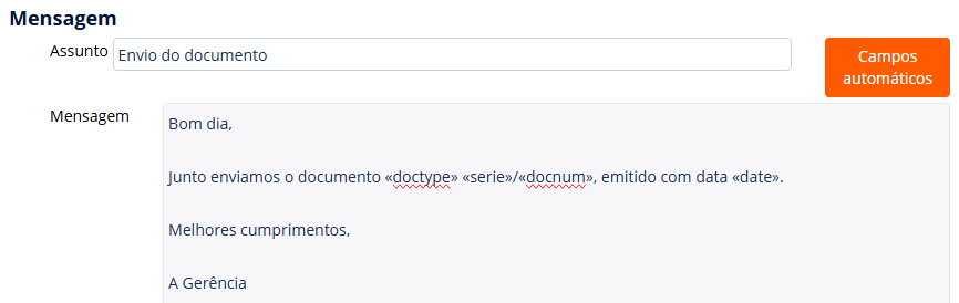 - No campo Mensagem, redigir o texto e utilizar o botão Campos Automáticos, para inserir os campos do documento.