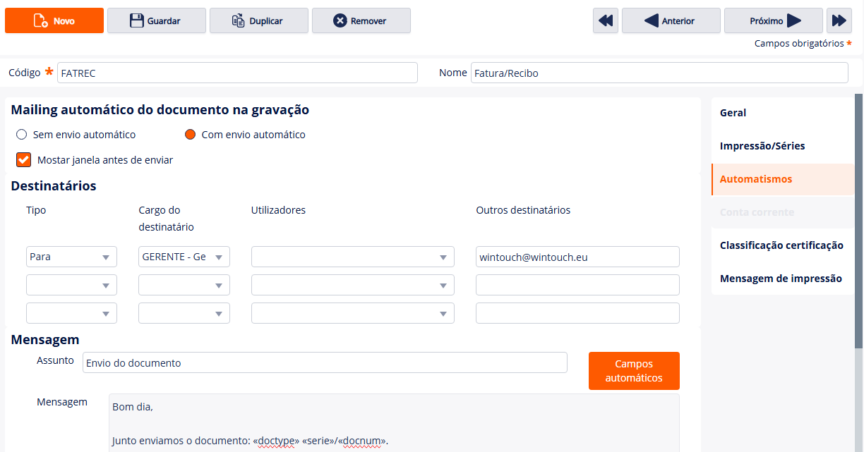 Na tabela Tipos de Documentos é possível configurar, para cada documento, os endereços de e-mail a utilizar automaticamente (Para, Cc e Bcc). Essa configuração pode ser feita tanto para endereços fixos, como para e-mails associados a um determinado cargo de destinatário. De seguida, apresentamos os passos necessários para efetuar esta configuração.